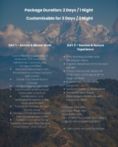 The program also includes hands‑on workshops in the farm’s organic garden, where participants learn how to make rhododendron petal-infused tea with herbal properties, and the leaf mulch enriches soil and supports the resort’s zero‑waste cycle. Evening sessions feature storytelling about the flower’s symbolism in Nepali folklore and its appearance on the national emblem.